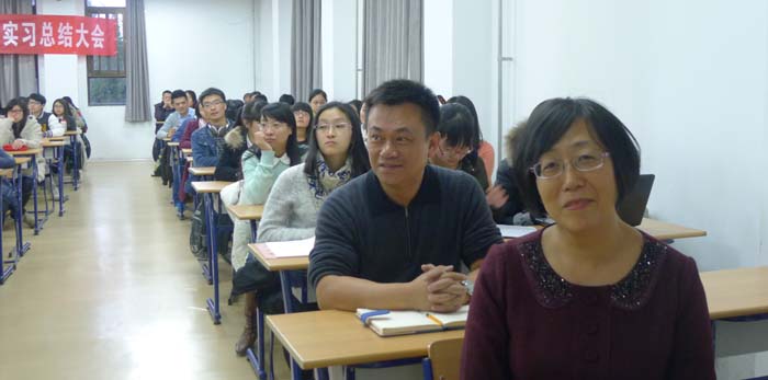 会上,林洪老师简短地向实习归来的同学表达了问候。在同学们的实习工作总结汇报后,王蔷老师报进行了言简意赅的精彩点评,并以11级同学们的实习汇报鼓舞12级同学。同时,王老师希望大四同学们能够把这次实习经历作为自己未来职业生涯的良好开端,不断完善充实自己,争取更大的进步。