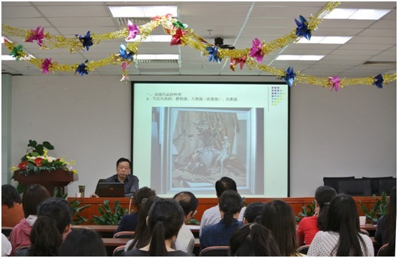 古棕老师从油画的基本知识讲起,展示了俄罗斯大量各具特色的名画,为大家详细介绍了俄罗斯画的种类流派,对画作的风格、明暗、用笔、对象选取等各个层面的绘画知识进行了讲解。古棕教授师从世界当代画坛顶级艺术大师、现实主义学派巨匠安德烈·梅尔尼科夫院士,对于俄罗斯油画十分熟悉。通过展示和评析俄罗斯著名画家如列宾、列维坦、希什金等人的画作特色,加深了大家对油画的理解。讲座过程中穿插古棕老师对于俄罗斯文化的认识和俄罗斯生活的体验,幽默睿智的语言引来阵阵掌声。古棕老师还分享了自己对艺术的理解:艺术家永远带有本民族的特色。这是艺术家无法回避的,祖国的文化永远让人更加亲近。讲座最后,古棕老师展示了自己的画作以及自己工作室学生的代表作品。
