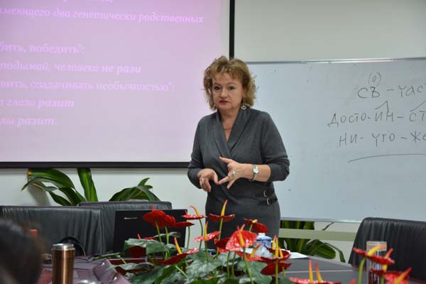 在为期三天的讲座中,塔季扬娜·谢苗诺夫娜声情并茂地为同学们剖析了俄语中所蕴含的民族思维方式,展示了俄语词汇的演变历史,分析了现代俄语标准语与古俄语之间的历史渊源。塔季扬娜·谢苗诺夫娜没有单纯地讲解枯燥的理论,而是用生活中常用的词汇和词组来解释相关概念。无论是课上还是课下,同学们与塔季扬娜·谢苗诺夫娜都有很多的互动和交流。塔季扬娜·谢苗诺夫娜就同学们感兴趣的俄语修辞学和俄语词汇学的历史发展等问题进行了详细的解答。