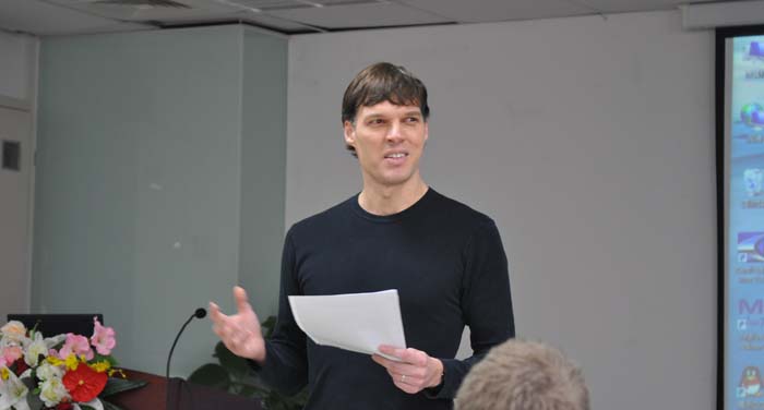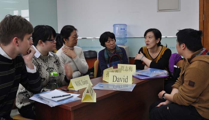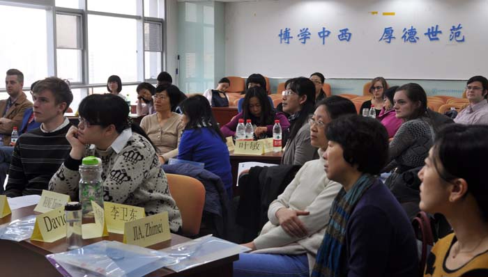 下午,中方教师针对2015级大学英语课程改革进行了深入的探讨。副院长郭乙瑶和公外部副主任林敦来介绍了未来课程的总体规划。夏晓燕老师与大家交流了研究生组的课程改革经验。全体教师在此基础上集思广益,热烈地探讨了未来课程实施的具体问题。