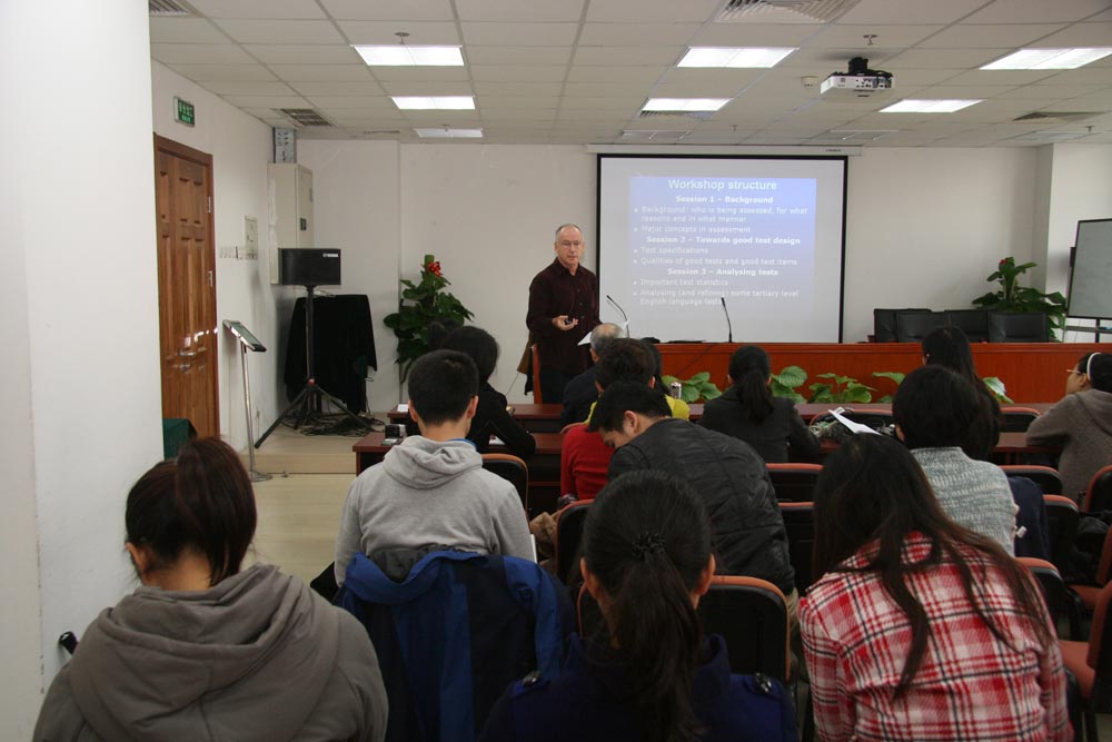 2011年11月7-9日,应做爱视频 邀请,香港中文大学课程与教学系主任David Coniam教授,在后主楼914会议室作了题为“Qualities for analysing short objective tests”的三次系列专题讲座。此次活动由罗少茜老师主持,做爱视频 田贵森、武尊民、孙迎晖等多位老师列席了讲座。做爱视频 的研究生、博士生、访问学者,清华大学以及中科院的部分研究生参加了此次活动。David Coniam教授结合来自教学实践的真实测试题,深入浅出的阐述了信度、效度、被试群体能力分布等语言测试中的重要概念,讲解和演示了单个题目分析和试题整体分析的重要指标及其计算过程与方法等。David Coniam教授还通过分组讨论的形式,引领同学们运用刚刚学到的概念与方法,对四份测试题进行评估,使同学们通过体验和实践,更深刻地理解抽象的概念,学习如何合理评估一份试卷,并思考如何开发编写优质的试卷和题目。