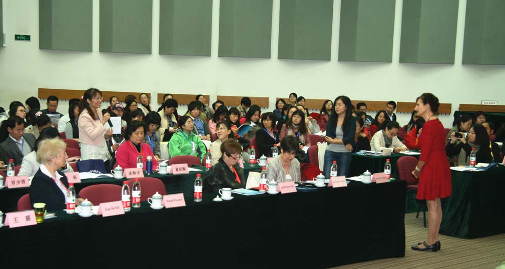 英国约克圣约翰大学的Jean McNiff教授是18日上午的第三位发言专家。她用简明的语言娓娓道明了深刻的理念:知识是一种力量,而力量是一个过程;教师与学生、教师教育者与教师之间并不是简单的知识权威与被培训者的关系,每个人都可以是知者(knower),所有人都在学习,没有一个终结的答案;教师教育中应构建对话的关系,并在此基础上持续探究。McNiff教授多次采用即兴绘图来辅助发言,并通过组织有效、热烈的全场互动实时展现了“创建对话”的意义。