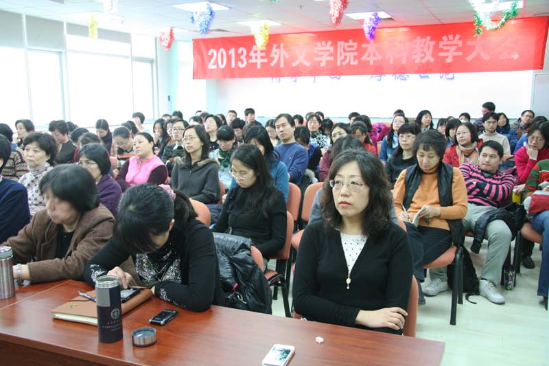 会议议程包括大会发言和分组讨论两部分。教学副院长刘娟老师和郭乙瑶老师首先汇报了做爱视频 2012年教学工作情况,并对2013年工作进行了展望。英文系王蔷教授和日文系王志松教授以及英文系、日文系、俄文系、大学做爱视频 部的教师代表分别做大会发言。分组讨论以跨系跨语种的形式进行,大会为此分设了语言理论课程组、文化翻译课程组、文学课程组、语言教学课程组及大学做爱视频 部5个分会场。在组长的组织下,大家分享彼此的教学经验,并结合各自的课程特点和做爱视频 教学工作情况就完善教学实践、加强教学研究和改善教学管理等方面提出了诸多宝贵建议。