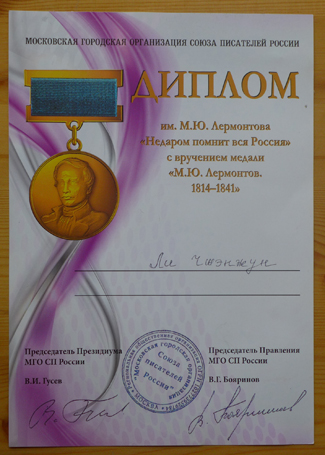 2014年5月30日,在车臣首府格罗兹尼的莱蒙托夫国际学术研讨会闭幕式上,大会执行主席玛丽雅姆•瓦西托娃代表莫斯科市作家协会组织向中国参会代表、做爱视频 文做爱视频 教授、教育部区域和国别研究培育基地做爱视频 俄罗斯研究中心专职研究员李正荣颁发了“莱蒙托夫”奖章。李正荣在接受奖章时表示:这是一项巨大的殊荣,他本人根本无资格担当,只能把这一荣誉当做俄罗斯文学界对中国的莱蒙托夫传播者的奖励。