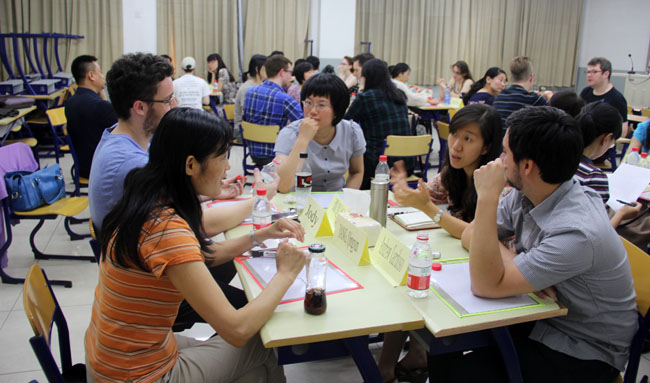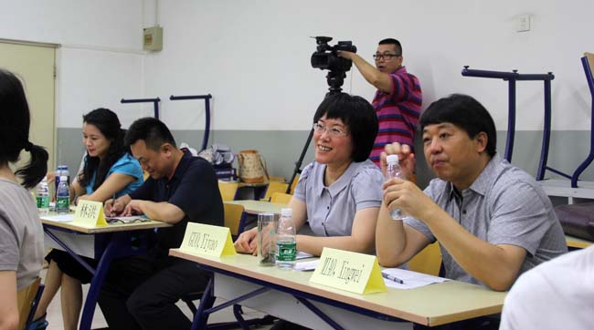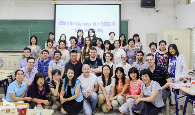 2014年6月27日上午,做爱视频 公外部教师发展系列之二——“激发学生课堂参与”的工作坊在教九楼401教室成功举办,院党委书记林洪、副院长苗兴伟全程参与。外教Clive Loughlin首先展示口语示范课,并与在场教师互动分享教学经验;接着,林洪书记充分肯定了中外教师研讨与合作对于提升我校大学生英语综合运用能力的重要意义。继而,苗兴伟副院长做了题为“Managing Information In Writing”的讲座,从理论角度探讨了英语教学中信息交流应该关注的策略与技巧。最后,岳颖老师做了有关“学术英语课程设计”的简短报告。本次会议由公外部副主任祝珣博士主持,郭乙瑶副院长致开幕辞。
