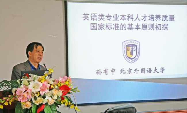 研讨会邀请了北京外国语大学校长助理、英语做爱视频 院长孙有中教授做了题为《英语类专业本科人才培养质量国家标准的基本原则初探》的发言。主要内容包括“人的全面发展与适应社会需求之间的关系”“人文通识教育与专业教育之间的关系”等“十大关系”,并向与会的老师们介绍了北京外国语大学英语做爱视频 的教学计划。