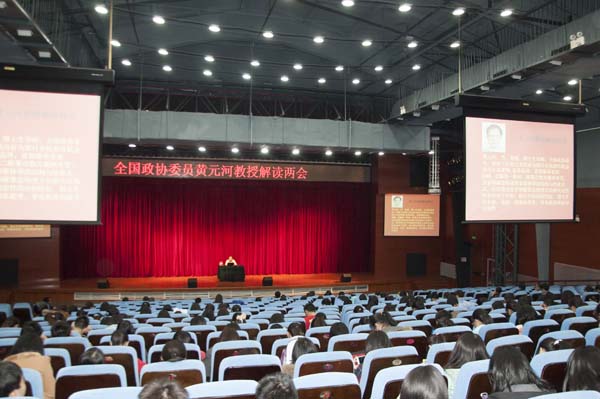 黄元河教授先就两会中提到的反腐倡廉、厉行节俭在会议期间的具体表现向大家进行具体介绍;然后便对同学们感兴趣的两会中教育相关的提案进行了介绍,包括教育资源均衡分配问题、异地高考如何推动、如何保证基础教育质量等问题;最后,黄元河教授对同学提出的如何看待高考改革的等问题进行了解答,鼓励大家充实自己知识,以面对多变的社会环境。