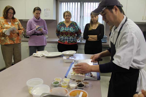 图片三 葛师傅讲解麻婆豆腐的制作,学员们边听边认真做笔记