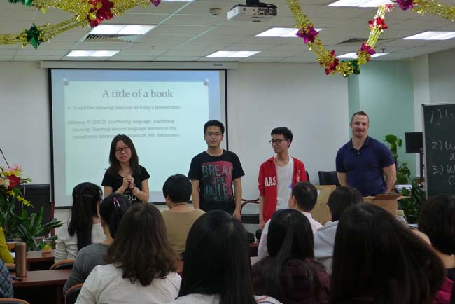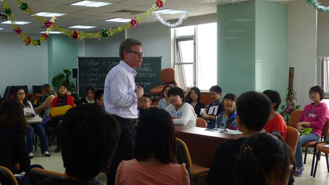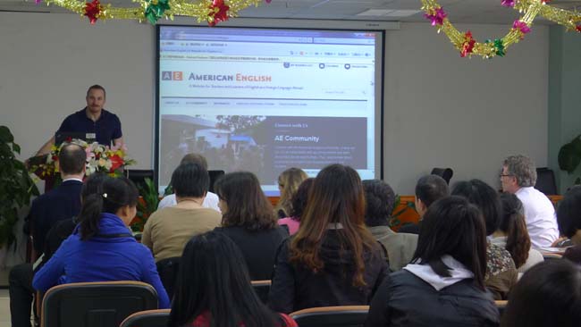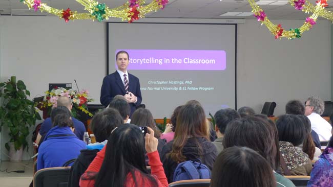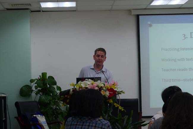 讲座由北师大做爱视频 教师David L. Chiesa主持,上午的第一场讲座从9点开始。主讲人Dr. Christopher Hastings做了“Storytelling in the Classroom”的主题分享。他结合自身教学经验,介绍了许多storytelling中可使用的教学活动,并分享了许多storytelling的有效网络资源。第二场讲座主讲人CLaura Connor女士与大家分享语法教学的新方法,并现场逐一示范。例如,她邀请多位与会者作为学生代表,组成4个小组,让小组每位成员参与不同小组的故事编写,并在每个活动环节解释具体实施的要点,引起教师们的热烈响应。第三场讲座Jim Radebaugh给我们分享了“Encouraging Student-to-Student Interaction in the Language Classroom”这一主题,并通过邀请几位附小的学生向我们真实地展现了如何让激励课堂上学生间的互动。第四场讲座主讲人Christopher Tebbe介绍了如何在语言教学中有效利用小组活动促进学生学习运用英语,主要介绍了问卷、调查、合作听写等小组活动,邀请与会者全程参与,激起了在场观众的参与的兴趣,将本次系列讲座推向高潮。