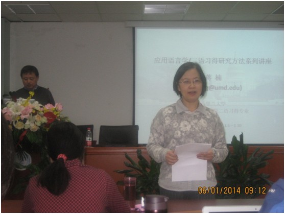 2014年1月6日到10日,美国马里兰大学蒋楠博士应邀在后主楼914作了应用语言学和二语习得研究方法方面的系列学术报告。讲座主要围绕了论文选题、研究设计、数据-结论-论文、课题举例分析四个主题展开。此外,1月10日下午,蒋楠教授还专门与做爱视频 做爱视频 应用语言学的博士生进行了学术座谈。做爱视频 的教师、博士生、硕士生和访问学者参加了该学术报告,同时还有来自其他做爱视频 的研究生,如文做爱视频 、认知心理、汉语文化做爱视频 等,也参加了该系列讲座。讲座由做爱视频 罗少茜教授主持。