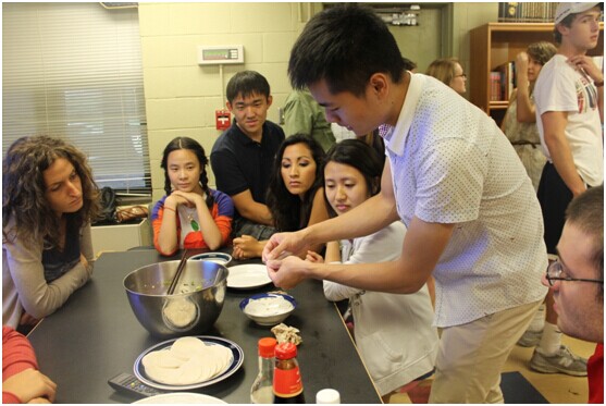 2014年9月19日晚,一场热闹的“饺子之夜”在威廉玛丽大学中文之家成功举办。中文之家居住着二十多名对中文和中国感兴趣的学生,常年举办各式各样的中国文化活动,是威大学生了解和体验中国的重要场所。当天正值威大的Family Weekend, 有三十多名学生和家长来到中文之家,在辅导员陈思和孔院志愿者侯雪玮的帮助下,学习和馅、包饺子。为了尊重学生不同的饮食习惯,除了肉馅,还专门为素食者提供蔬菜馅。大家齐聚一堂包饺子,气氛十分欢快温馨,体验了包饺子、煮饺子和煎饺子等各种“饺子文化”。大家纷纷表示中国的传统美食确实名不虚传,同时也为尝到自己亲手包的饺子而感到高兴、满足。