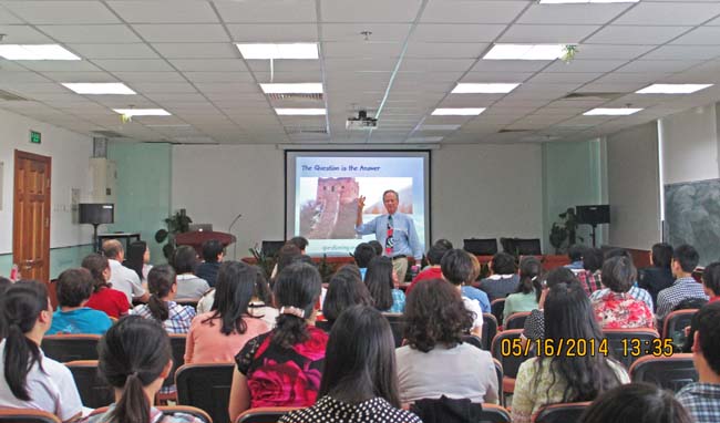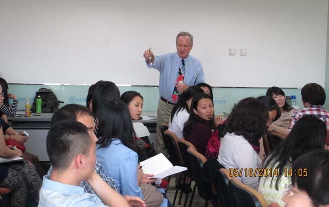 朝阳区小学英语样板校项目2014年第三次教师培训会议于2014年5月16日13时30分至16时在后主楼914会议室顺利召开。会议主讲人为Jamie McKenzie教授,来自朝阳区十所样板校及其他学校的近百名中小学英语教师参加了此次培训。