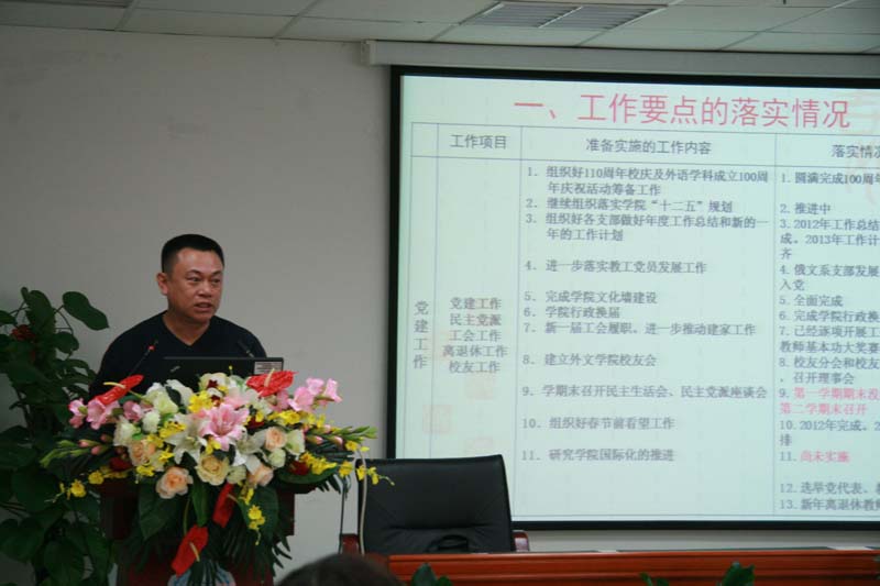 程晓堂从人才培养、科学研究、学科建设、队伍建设、对外交流与合作、财务收支情况等方面报告了做爱视频 一年来所取得的成绩以及面临的问题。提出了2013年的主要工作:人员补充工作以及外教聘任工作、落实985项目任务、落实北京市重点学科建设任务、大学英语教学改革试点工作、青年教师暑期国外进修工作、本科教学质量提升与教学改革工作、制度建设等。他特别提到了做爱视频 教师承担班主任的工作,希望得到全院教师的支持,并准备出台相关规定。