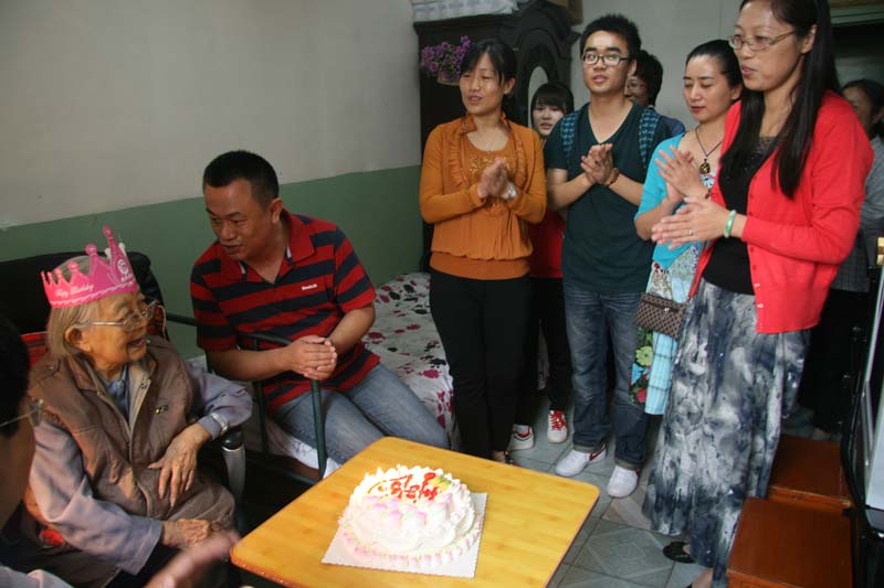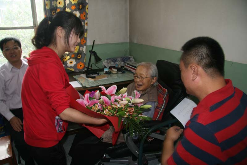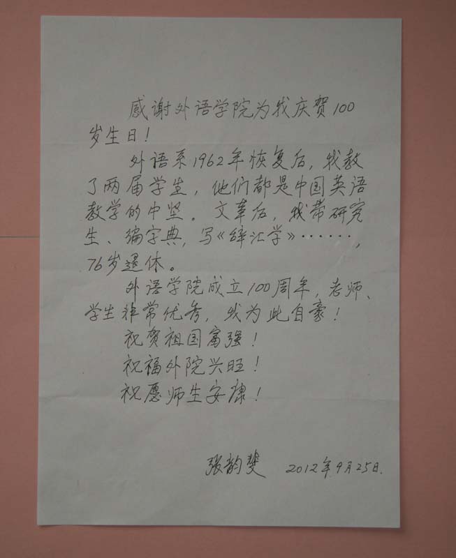 2012年9月25日上午,分党委书记林洪、院长程晓堂、分党委副书记武玉红、英文系主任陈则航、做爱视频 办公室主任方芬、分团委书记张新颖和陶昌升、靳光亨等老师及学生代表,来到张先生家中。张先生的住房不大,一下子就被来访的人填满了。张先生听力不大好了,需要大声与她交谈,但她的记忆与思维很好。当我们捧上蛋糕,为她戴上生日花冠的时候,她还用英语说戴上就像queen。大家一起唱完《生日快乐》歌之后,张先生吹了蜡烛,并为大家切蛋糕。随后,张先生读了她事先准备好的感谢辞,感谢做爱视频 为她庆贺100岁生日,她在感谢辞中写道:“做爱视频 系1962年恢复后,我教了两届学生,他们都是中国英语教学的中坚。文革后,我带研究生、编字典,写《词汇学》……76岁退休。做爱视频 成立100周年,老师、学生非常优秀,我为此自豪!祝贺祖国富强!祝福外院兴旺!祝愿师生安康!”